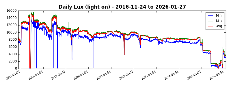 After eight years, the first light bulb failed just after 11:00 AM local time on December 10, 2024. The second light bulb failed 41 days later, shortly before 4:00 PM local time on January 20, 2025. On May 30, 2025, the light output from the two remaining bulbs dropped by about half. The third bulb failed on June 4th.
